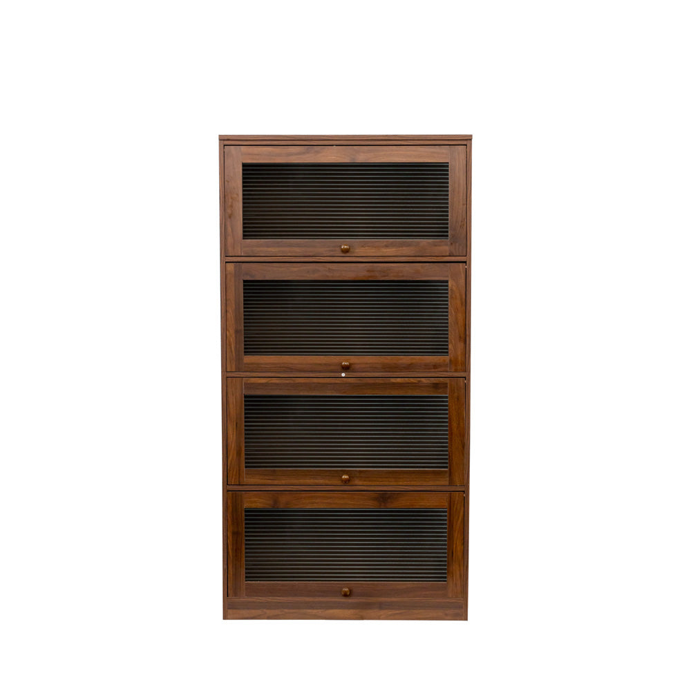 Elevate your space with the Konn Storage Cabinet. Its mid-century modern design adds a touch of timeless style to any room. The glass doors feature a unique channeled effect, while the four-tiered shelves provide ample storage space. To access your belongings, simply push the doors upwards and in.