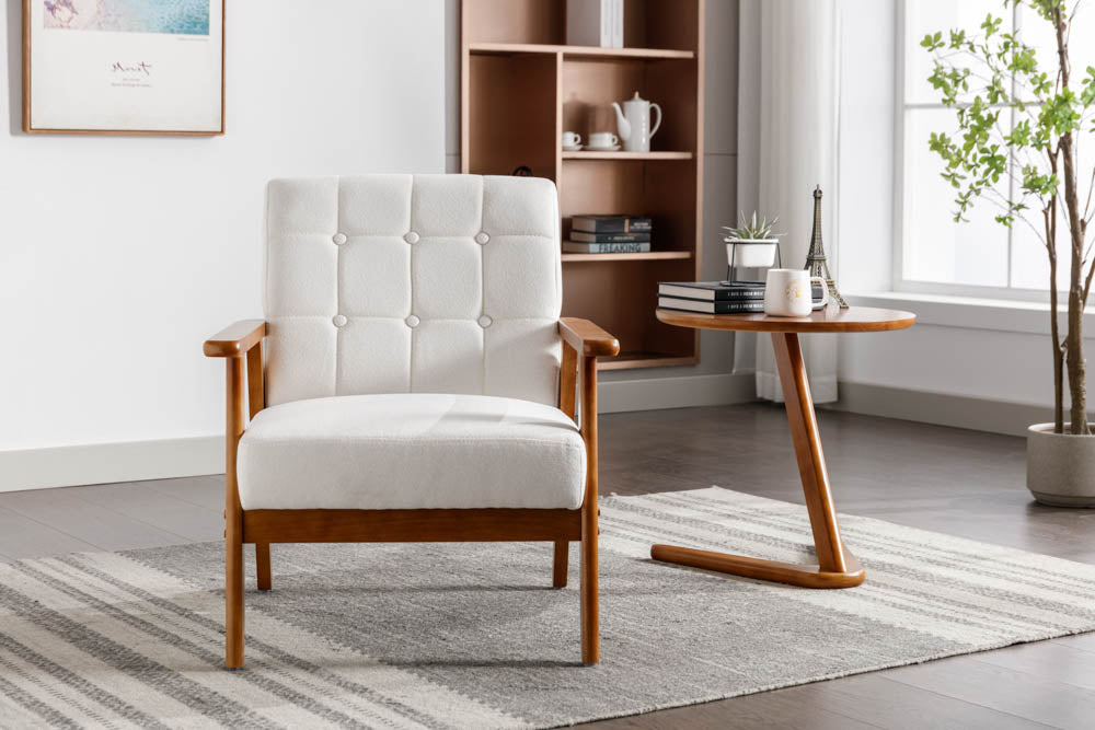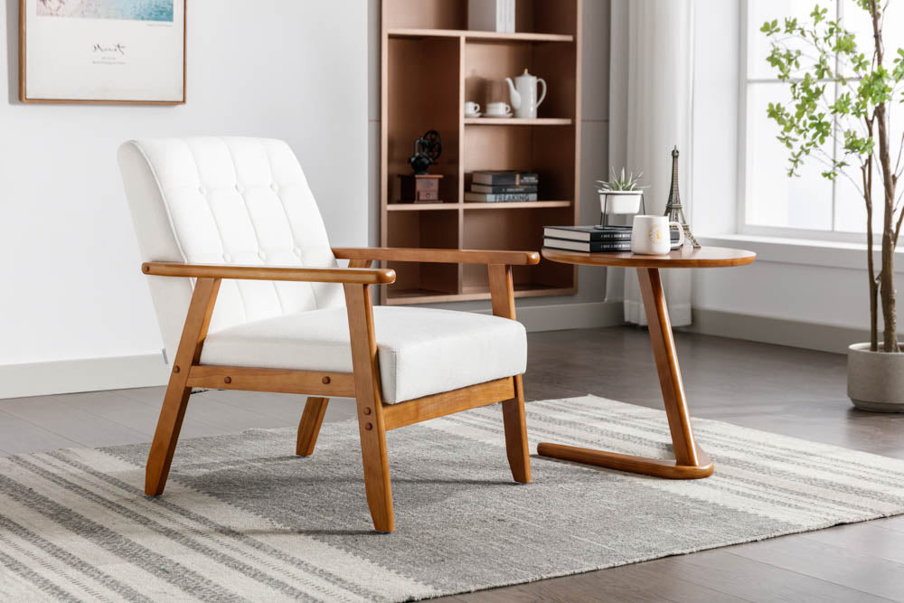 Indulge in luxury with our Kyle Accent Chair. Featuring solid wood armrests and faux linen upholstery, this mid-century modern design adds sophistication and comfort to any space.