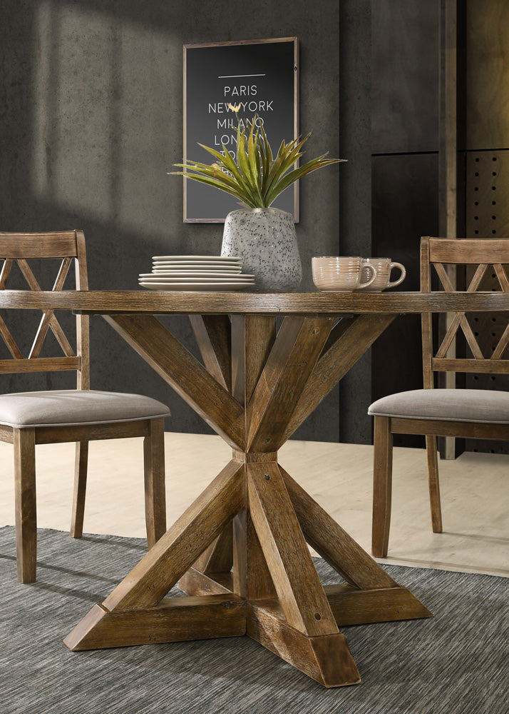 Experience the rustic charm of our Windvale Dining Table with its warm cottage oak finish. Its round surface allows for intimate conversations while the cross-buck base adds a touch of country elegance. Perfect for creating a cozy dining experience for you and your loved ones.