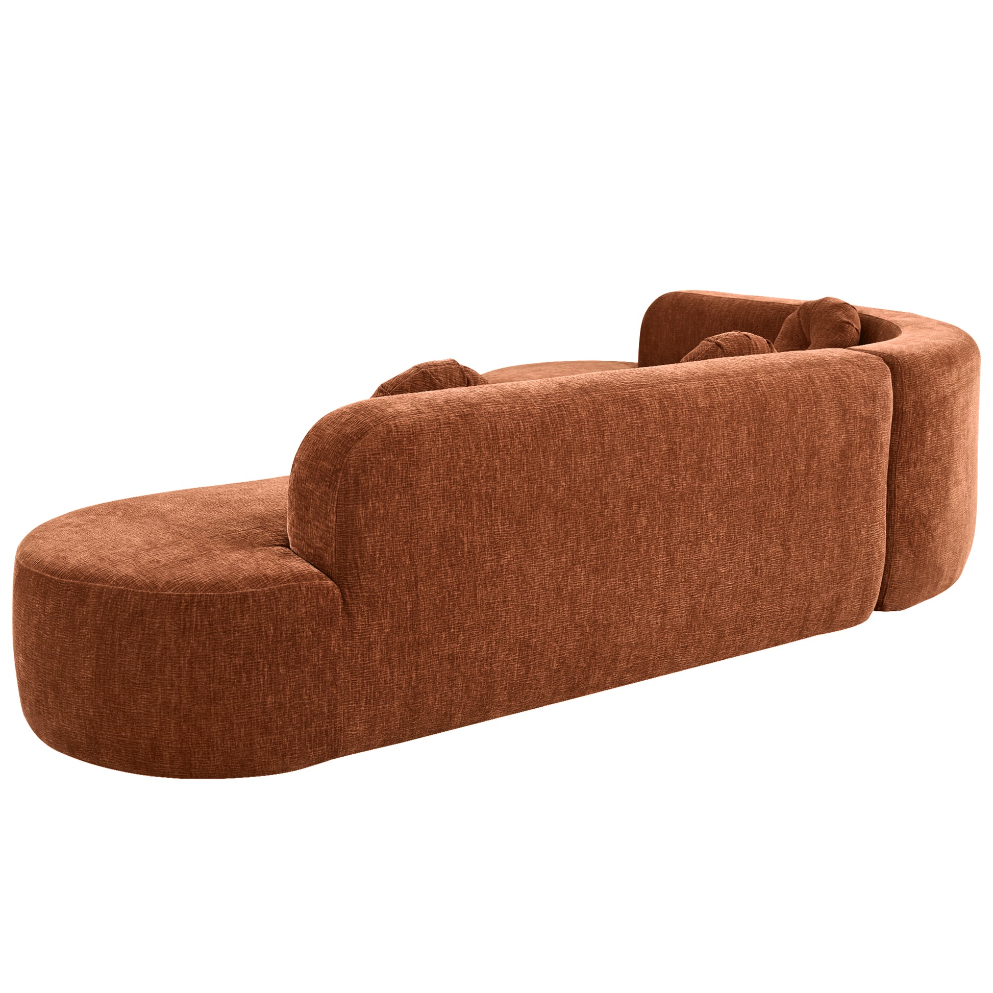 A sculptural blend of comfort and modern artistry, this curved sectional sofa transforms any living space into a statement of refined design. Wrapped in soft chenille fabric with a rich burnt orange hue, its smooth, rounded silhouette exudes warmth and sophistication. The generous seating accommodates up to five guests, while three matching circular cushions add a touch of playful elegance. Fully assembled and ready to enjoy, this sofa is designed for effortless living and lasting comfort.