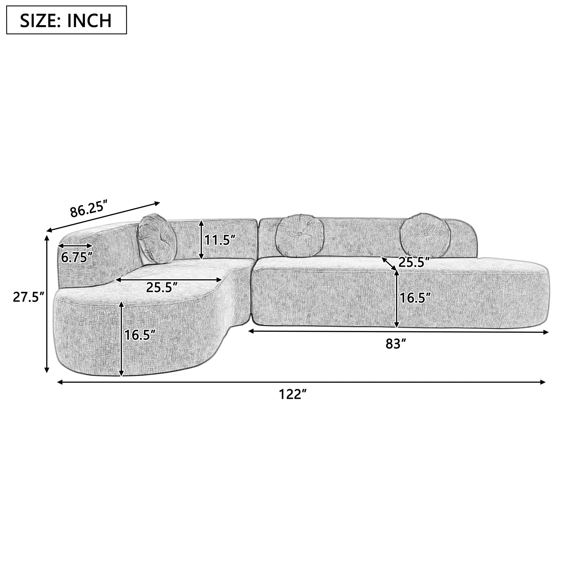 - Overall Dimensions: 122"W × 86.25"D × 27.5"H