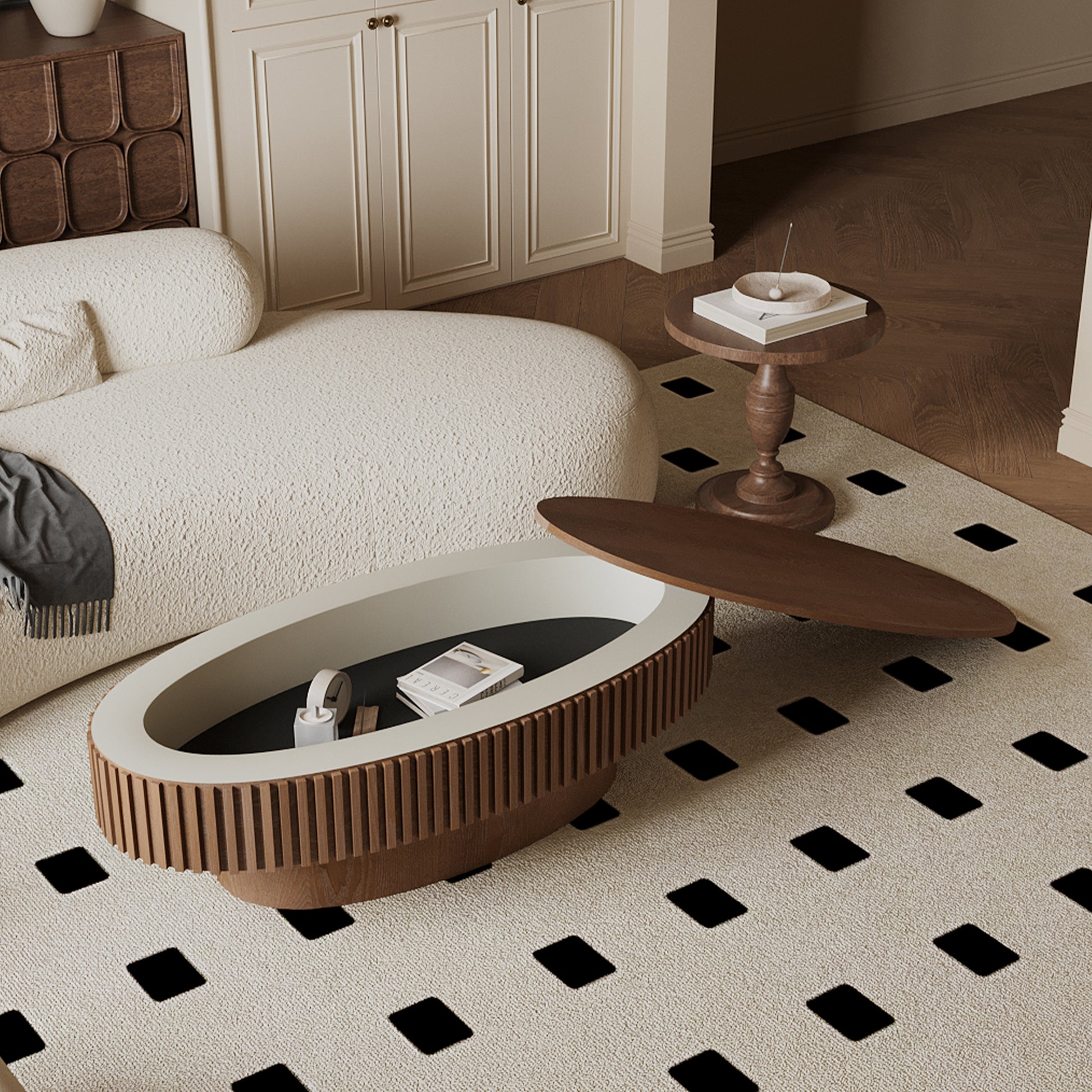 The Aveline Oval Coffee Table brings sculptural beauty and thoughtful functionality into the heart of your living space. Designed with a concealed storage compartment beneath its lift-top surface, perfect for stowing everyday essentials. Defined by its softly rounded silhouette and refined fluted detailing, this piece offers a modern interpretation of organic design.