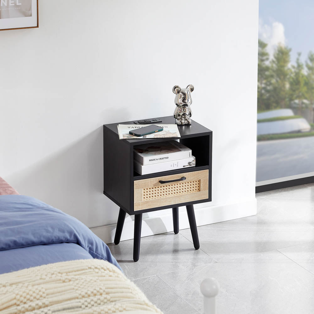 Introducing the Rattan End Table with built-in power outlets and USB ports. This modern and multifunctional design offers convenient access to charging your devices while providing open shelf storage space and a rattan woven pull out drawer. Plus, solid wooden legs for added durability. Stay connected and organized with this stylish addition to your home.