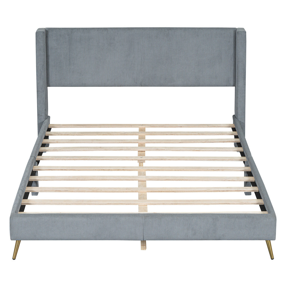 Elevate your bedroom with the Cory Queen Platform Bed. The modern corduroy upholstery adds a touch of sophistication while the metal legs provide stability. Its contemporary design is perfect for any style, making it a versatile and stylish addition to your space. Sleep in comfort and style with this beautiful platform bed.